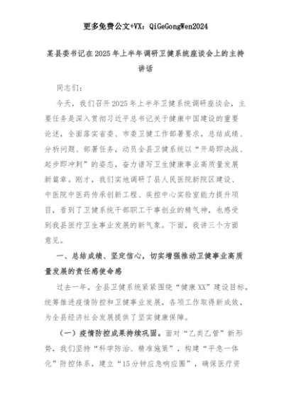 【七哥公文】2025年:某县委书记在2025年上半年调研卫健系统座谈会上的主持讲话+更多免费公文+VX:QiGeGongWen2024+更多免费公文+VX:QiGeGongWen2024