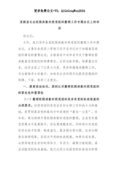 【七哥公文】2025年:某副县长在软弱涣散村级党组织整顿工作专题会议上的讲话+更多免费公文+VX:QiGeGongWen2024+更多免费公文+VX:QiGeGongWen2024