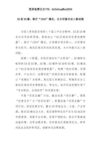 【七哥公文】2025年:XX县XX镇:推行“1234”模式,为乡村振兴注入新动能+更多免费公文+VX:QiGeGongWen2024+更多免费公文+VX:QiGeGongWen2024