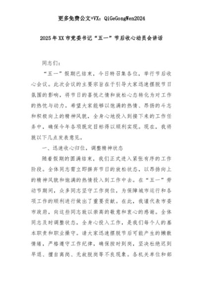 【七哥公文】2025年:2025年XX市党委书记“五一”节后收心动员会讲话+更多免费公文+VX:QiGeGongWen2024+更多免费公文+VX:QiGeGongWen2024