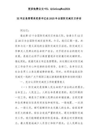 【七哥公文】2025年:XX市应急管理局党委书记在2025年全国防灾减灾日讲话+更多免费公文+VX:QiGeGongWen2024+更多免费公文+VX:QiGeGongWen2024