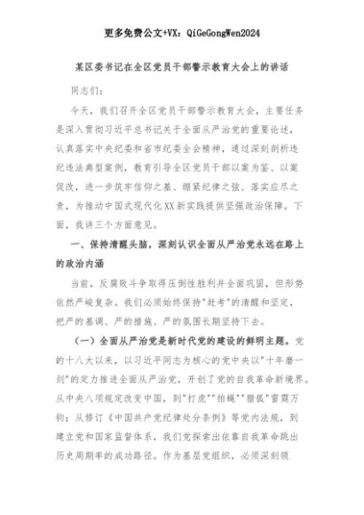 【七哥公文】2025年:某区委书记在全区党员干部警示教育大会上的讲话+更多免费公文+VX:QiGeGongWen2024+更多免费公文+VX:QiGeGongWen2024