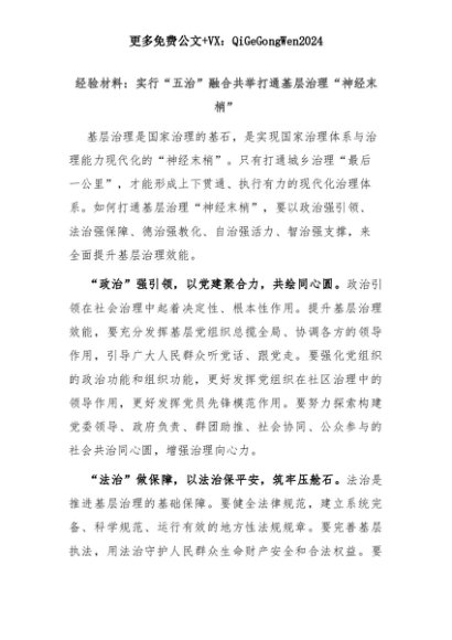 【七哥公文】2025年:经验材料:实行“五治”融合共举打通基层治理“神经末梢”+更多免费公文+VX:QiGeGongWen2024+更多免费公文+VX:QiGeGongWen2024