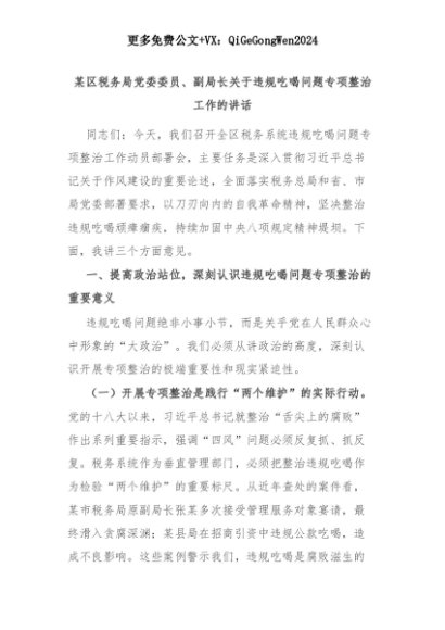 【七哥公文】2025年:某区税务局党委委员、副局长关于违规吃喝问题专项整治工作的讲话+更多免费公文+VX:QiGeGongWen2024+更多免费公文+VX:QiGeGongWen2024
