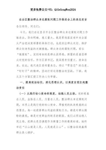 【七哥公文】2025年:在全区整治群众身边腐败问题工作推进会上的表态发言+更多免费公文+VX:QiGeGongWen2024+更多免费公文+VX:QiGeGongWen2024