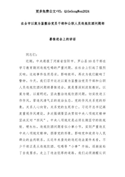 【七哥公文】2025年:在全市以案为鉴整治党员干部和公职人员违规饮酒问题部署推进会上的讲话+更多免费公文+VX:QiGeGongWen2024+更多免费公文+VX:QiGeGongWen2024