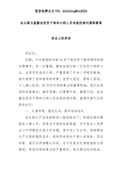 【七哥公文】2025年:在以案为鉴整治党员干部和公职人员违规饮酒问题部署推进会上的讲话+更多免费公文+VX:QiGeGongWen2024+更多免费公文+VX:QiGeGongWen2024