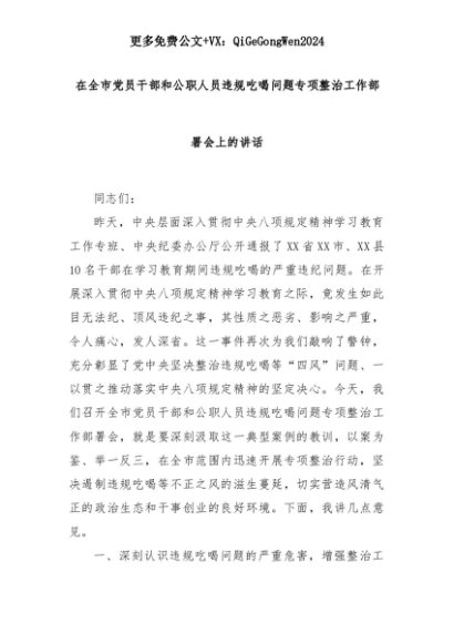 【七哥公文】2025年:在全市党员干部和公职人员违规吃喝问题专项整治工作部署会上的讲话+更多免费公文+VX:QiGeGongWen2024+更多免费公文+VX:QiGeGongWen2024
