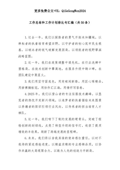 【七哥公文】2025年:工作总结和工作计划排比句汇编(共50条)+更多免费公文+VX:QiGeGongWen2024+更多免费公文+VX:QiGeGongWen2024