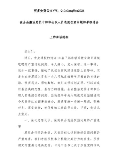 【七哥公文】2025年:在全县整治党员干部和公职人员违规饮酒问题部署推进会上的讲话提纲+更多免费公文+VX:QiGeGongWen2024+更多免费公文+VX:QiGeGongWen2024