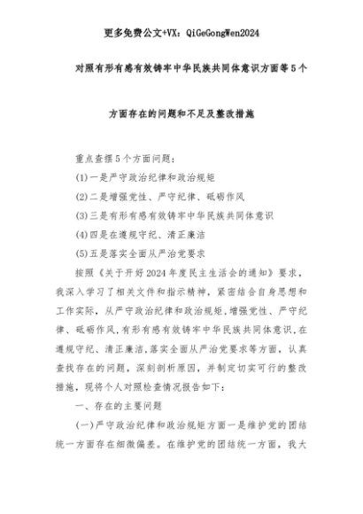 【七哥公文】2025年:对照有形有感有效铸牢中华民族共同体意识方面等 5 个方面存在的问题和不足及整改措施+更多免费公文+VX:QiGeGongWen2024+更多免费公文+VX:QiGeGongWen2024