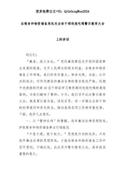【七哥公文】2025年:在粮食和物资储备局机关全体干部违规吃喝警示教育大会上的讲话+更多免费公文+VX:QiGeGongWen2024+更多免费公文+VX:QiGeGongWen2024