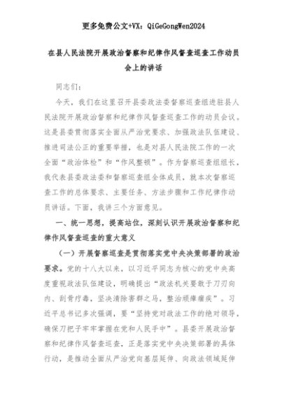 【七哥公文】2025年:在县人民法院开展政治督察和纪律作风督查巡查工作动员会上的讲话+更多免费公文+VX:QiGeGongWen2024+更多免费公文+VX:QiGeGongWen2024