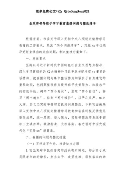 【七哥公文】2025年:县政府领导班子学习教育查摆问题与整改清单+更多免费公文+VX:QiGeGongWen2024+更多免费公文+VX:QiGeGongWen2024