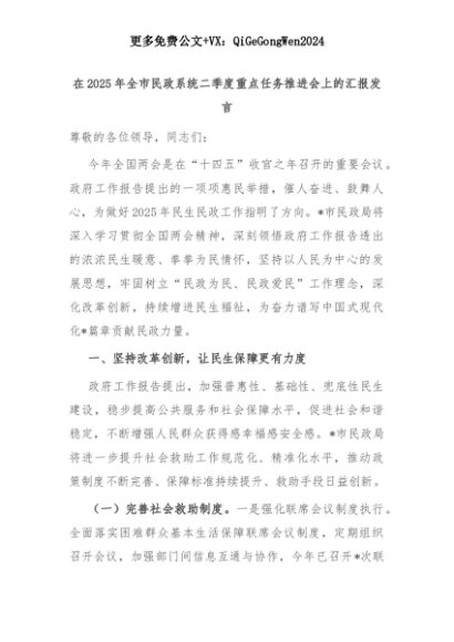 【七哥公文】2025年:在2025年全市民政系统二季度重点任务推进会上的汇报发言+更多免费公文+VX:QiGeGongWen2024+更多免费公文+VX:QiGeGongWen2024