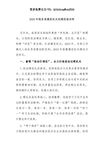 【七哥公文】2025年:2025年税务局模范机关创建经验材料+更多免费公文+VX:QiGeGongWen2024+更多免费公文+VX:QiGeGongWen2024