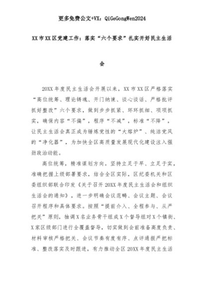 【七哥公文】2025年:XX市XX区党建工作:落实“六个要求”扎实开好民主生活会+更多免费公文+VX:QiGeGongWen2024+更多免费公文+VX:QiGeGongWen2024