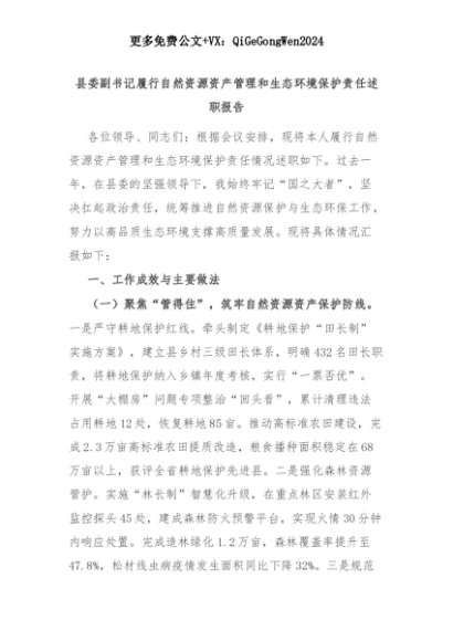 【七哥公文】2025年:县委副书记履行自然资源资产管理和生态环境保护责任述职报告+更多免费公文+VX:QiGeGongWen2024+更多免费公文+VX:QiGeGongWen2024
