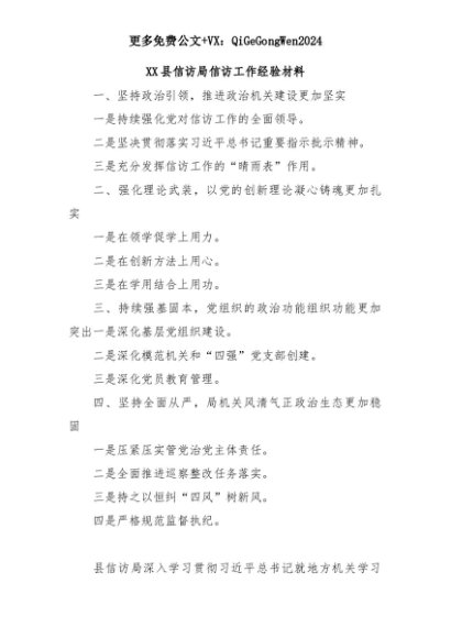 【七哥公文】2025年:XX县信访局信访工作经验材料+更多免费公文+VX:QiGeGongWen2024+更多免费公文+VX:QiGeGongWen2024