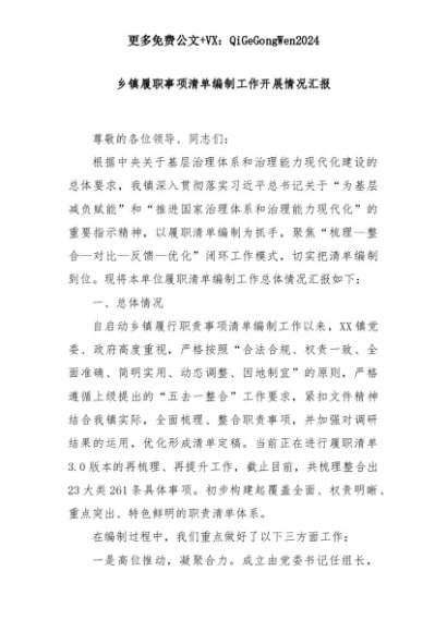 【七哥公文】2025年:乡镇履职事项清单编制工作开展情况汇报+更多免费公文+VX:QiGeGongWen2024+更多免费公文+VX:QiGeGongWen2024