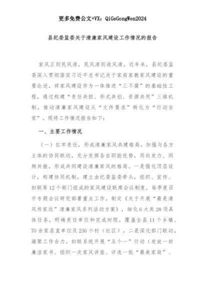 【七哥公文】2025年:县纪委监委关于清廉家风建设工作情况的报告+更多免费公文+VX:QiGeGongWen2024+更多免费公文+VX:QiGeGongWen2024