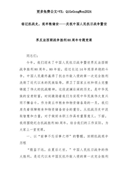 【七哥公文】2025年:铭记抗战史,筑牢粮储安——庆祝中国人民抗日战争暨世界反法西斯战争胜利80周年专题党课+更多免费公文+VX:QiGeGongWen2024+更多免费公文+VX:QiGeGongWen2024
