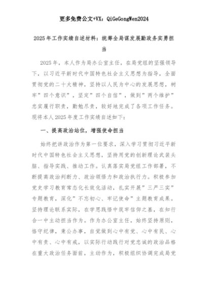 【七哥公文】2025年:2025年工作实绩自述材料:统筹全局谋发展勤政务实勇担当+更多免费公文+VX:QiGeGongWen2024+更多免费公文+VX:QiGeGongWen2024