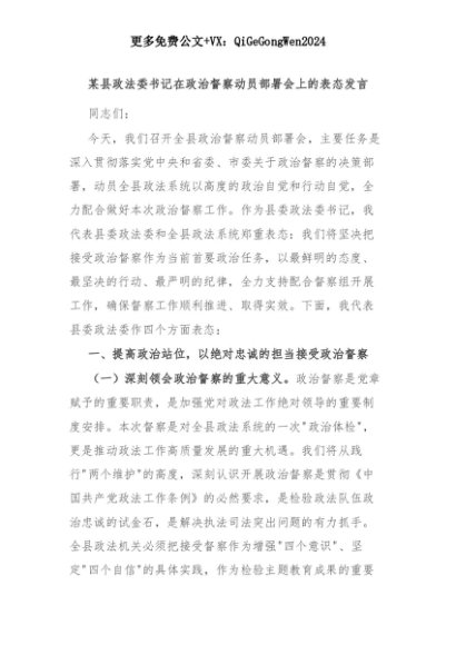 【七哥公文】2025年:某县政法委书记在政治督察动员部署会上的表态发言+更多免费公文+VX:QiGeGongWen2024+更多免费公文+VX:QiGeGongWen2024