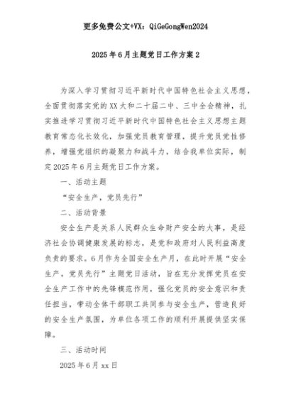 【七哥公文】2025年:2025年6月主题党日工作方案2+更多免费公文+VX:QiGeGongWen2024+更多免费公文+VX:QiGeGongWen2024