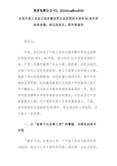 【七哥公文】2025年:庆祝中国人民抗日战争暨世界反法西斯战争胜利80周年思政课讲稿:铭记抗战史,筑牢粮储安+更多免费公文+VX:QiGeGongWen2024+更多免费公文+VX:QiGeGongWen2024