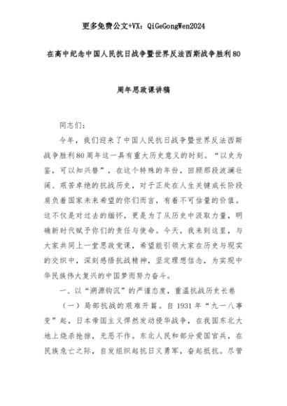 【七哥公文】2025年:在高中纪念中国人民抗日战争暨世界反法西斯战争胜利80周年思政课讲稿+更多免费公文+VX:QiGeGongWen2024+更多免费公文+VX:QiGeGongWen2024