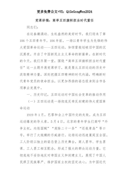 【七哥公文】2025年:党课讲稿:高举五四旗帜担当时代重任+更多免费公文+VX:QiGeGongWen2024+更多免费公文+VX:QiGeGongWen2024