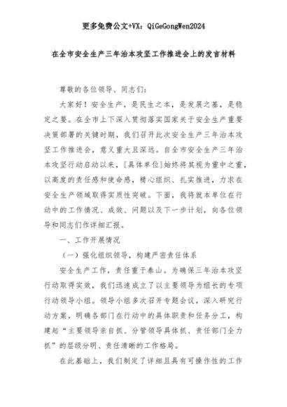 【七哥公文】2025年:在全市安全生产三年治本攻坚工作推进会上的发言材料+更多免费公文+VX:QiGeGongWen2024+更多免费公文+VX:QiGeGongWen2024