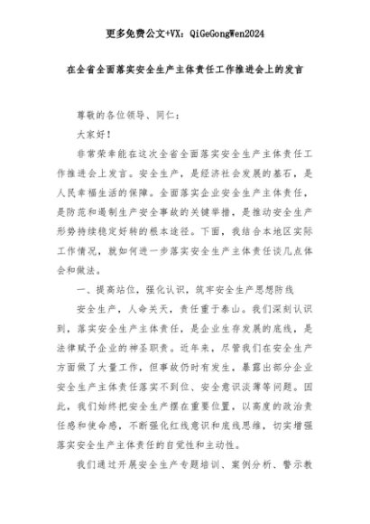 【七哥公文】2025年:在全省全面落实安全生产主体责任工作推进会上的发言+更多免费公文+VX:QiGeGongWen2024+更多免费公文+VX:QiGeGongWen2024