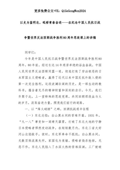 【七哥公文】2025年:以史为鉴明志,砥砺青春奋进——在纪念中国人民抗日战争暨世界反法西斯战争胜利80周年思政课上的讲稿+更多免费公文+VX:QiGeGongWen2024+更多免费公文+VX:QiGeGongWen2024