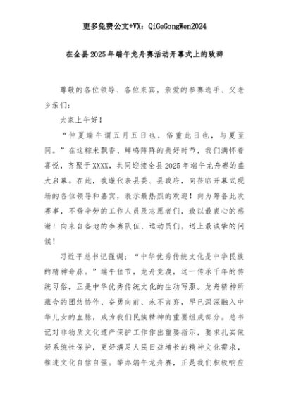 【七哥公文】2025年:在全县2025年端午龙舟赛活动开幕式上的致辞+更多免费公文+VX:QiGeGongWen2024+更多免费公文+VX:QiGeGongWen2024