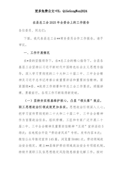 【七哥公文】2025年:在县总工会2025年全委会上的工作报告+更多免费公文+VX:QiGeGongWen2024+更多免费公文+VX:QiGeGongWen2024