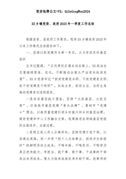 【七哥公文】2025年:XX乡镇党委、政府2025年一季度工作总结+更多免费公文+VX:QiGeGongWen2024+更多免费公文+VX:QiGeGongWen2024