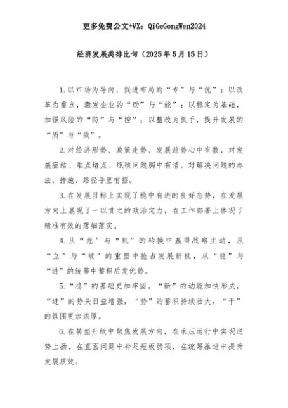 【七哥公文】2025年:经济发展类排比句(2025年5月15日)+更多免费公文+VX:QiGeGongWen2024+更多免费公文+VX:QiGeGongWen2024