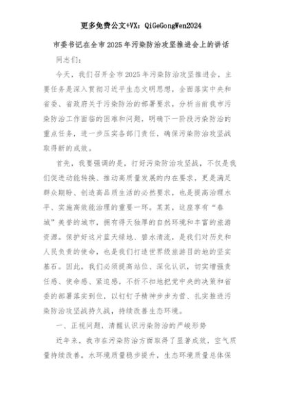 【七哥公文】2025年:市委书记在全市2025年污染防治攻坚推进会上的讲话+更多免费公文+VX:QiGeGongWen2024+更多免费公文+VX:QiGeGongWen2024
