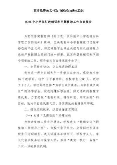 【七哥公文】2025年:2025中小学征订教辅谋利问题整治工作自查报告+更多免费公文+VX:QiGeGongWen2024+更多免费公文+VX:QiGeGongWen2024