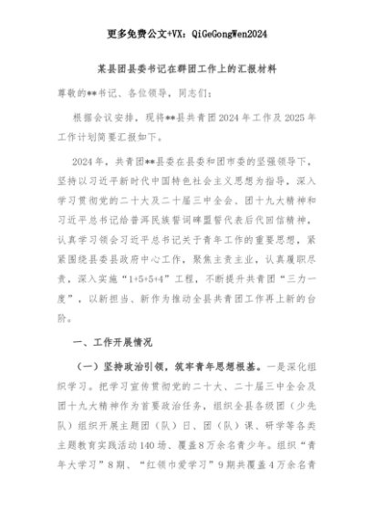 【七哥公文】2025年:某县团县委书记在群团工作上的汇报材料+更多免费公文+VX:QiGeGongWen2024+更多免费公文+VX:QiGeGongWen2024