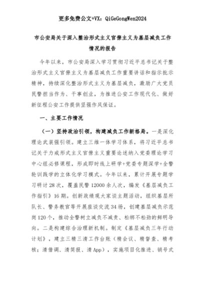 【七哥公文】2025年:市公安局关于深入整治形式主义官僚主义为基层减负工作情况的报告+更多免费公文+VX:QiGeGongWen2024+更多免费公文+VX:QiGeGongWen2024