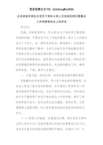 【七哥公文】2025年:在县委宣传部机关党员干部和公职人员违规饮酒问题整治工作部署推进会上的讲话+更多免费公文+VX:QiGeGongWen2024+更多免费公文+VX:QiGeGongWen2024