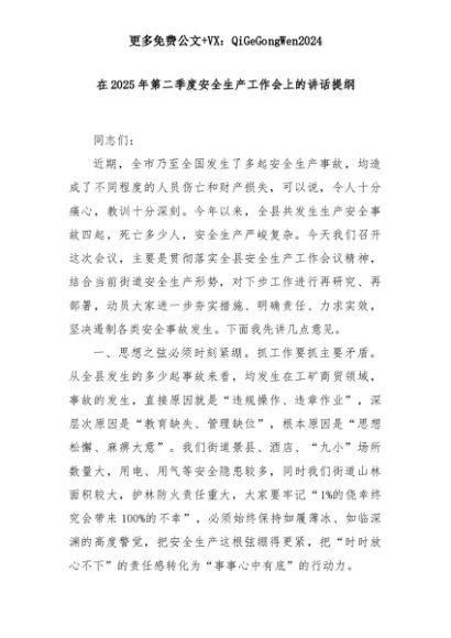 【七哥公文】2025年:在2025年第二季度安全生产工作会上的讲话提纲+更多免费公文+VX:QiGeGongWen2024+更多免费公文+VX:QiGeGongWen2024
