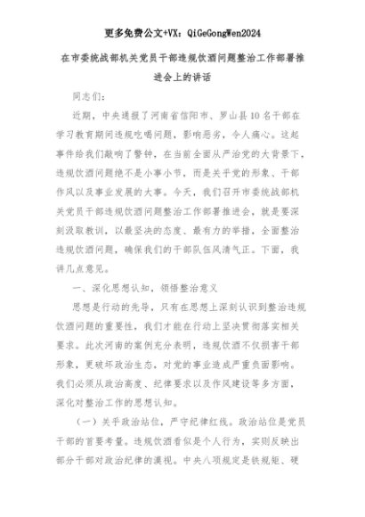 【七哥公文】2025年:在市委统战部机关党员干部违规饮酒问题整治工作部署推进会上的讲话+更多免费公文+VX:QiGeGongWen2024+更多免费公文+VX:QiGeGongWen2024