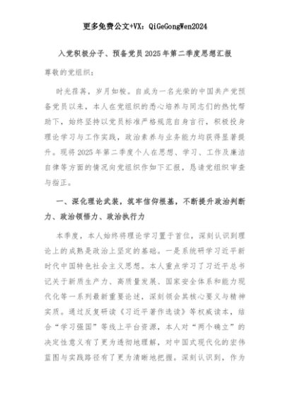 【七哥公文】2025年:入党积极分子、预备党员2025年第二季度思想汇报+更多免费公文+VX:QiGeGongWen2024+更多免费公文+VX:QiGeGongWen2024
