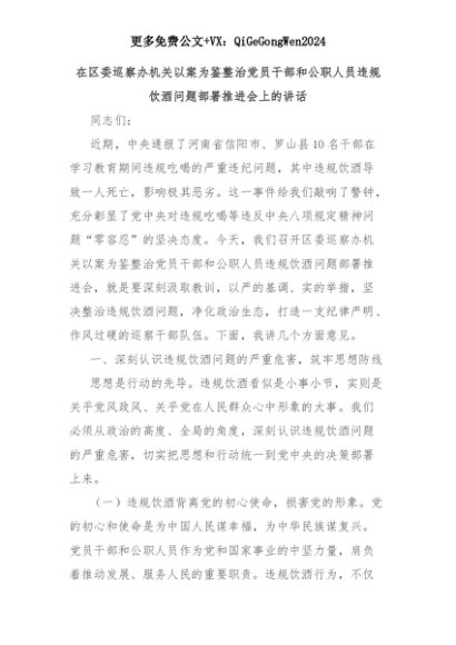 【七哥公文】2025年:在区委巡察办机关以案为鉴整治党员干部和公职人员违规饮酒问题部署推进会上的讲话+更多免费公文+VX:QiGeGongWen2024+更多免费公文+VX:QiGeGongWen2024