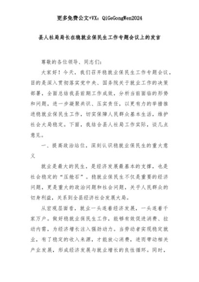 【七哥公文】2025年:县人社局局长在稳就业保民生工作专题会议上的发言+更多免费公文+VX:QiGeGongWen2024+更多免费公文+VX:QiGeGongWen2024
