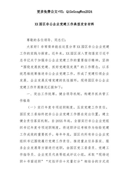 【七哥公文】2025年:XX园区非公企业党建工作典型发言材料+更多免费公文+VX:QiGeGongWen2024+更多免费公文+VX:QiGeGongWen2024
